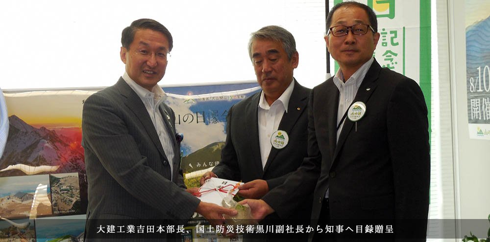 大建工業株式会社様、国土防災技術株式会社様から、第3回「山の日」記念全国大会in鳥取実行委員会へ物品協賛をしていただけることになり、平成30年8月6日に協賛物品の贈呈式が行われました。